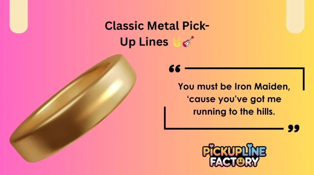 Metal pick up lines are flirty one-liners inspired by heavy metal music, bands, and concerts. They’re funny, bold, and perfect for impressing fellow rock lovers.